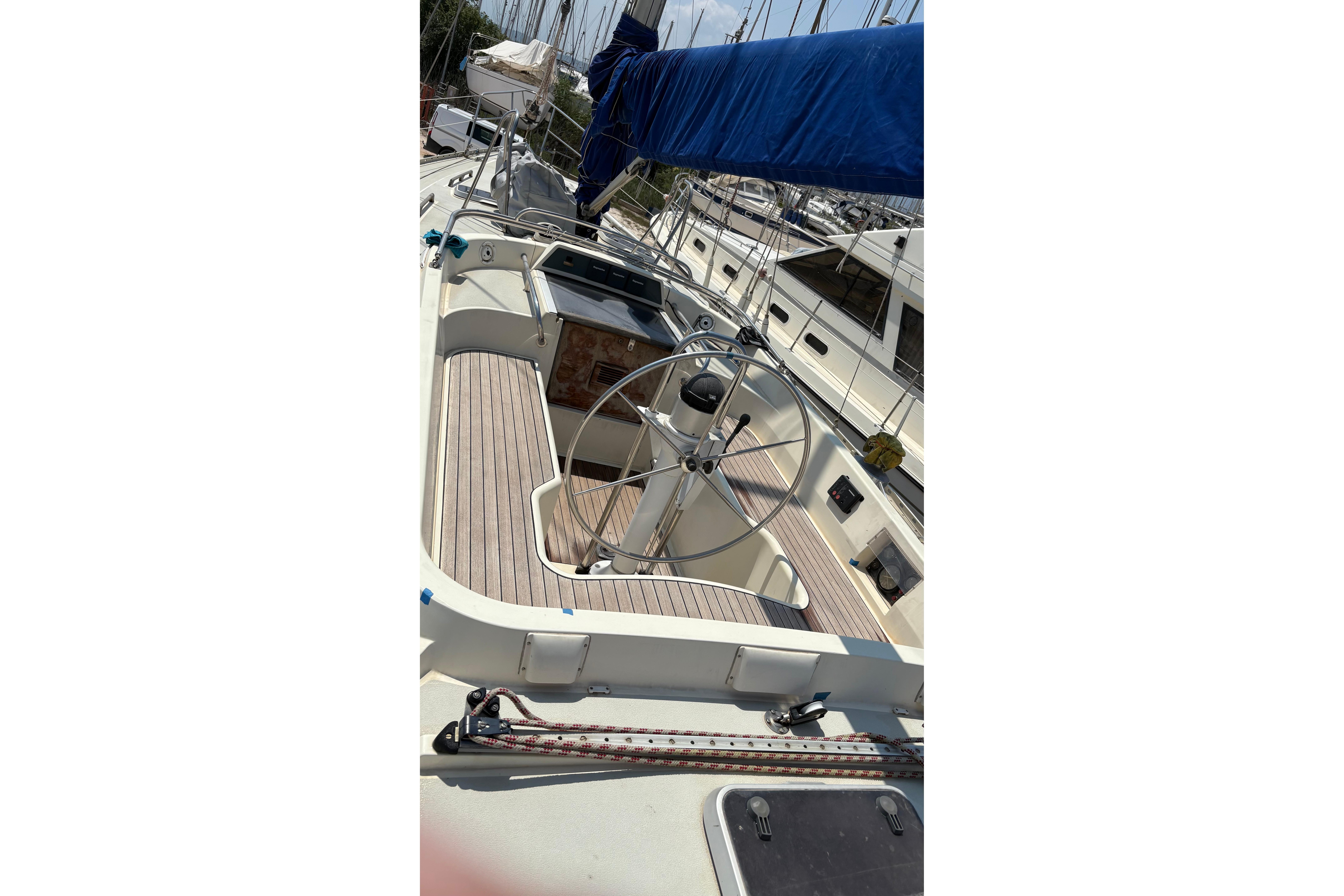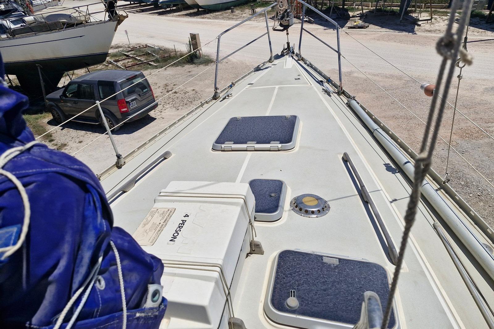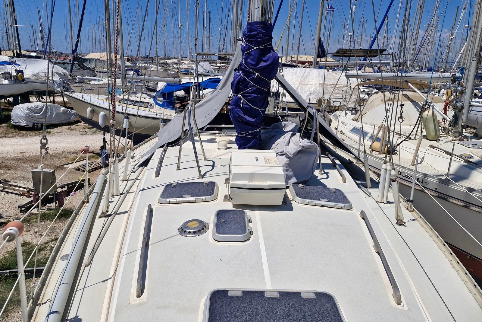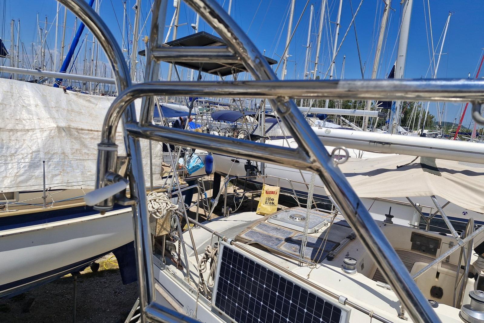 Currently ashore in Preveza, Greece and now registered under the Delaware (USA) flag, she offers comfortable accommodation for six in three cabins plus saloon, with two heads. Equipped with electric windlass, Raymarine navigation equipment and solar panels, she represents a capable and sensibly specified cruising yacht ideal for extended Mediterranean cruising.