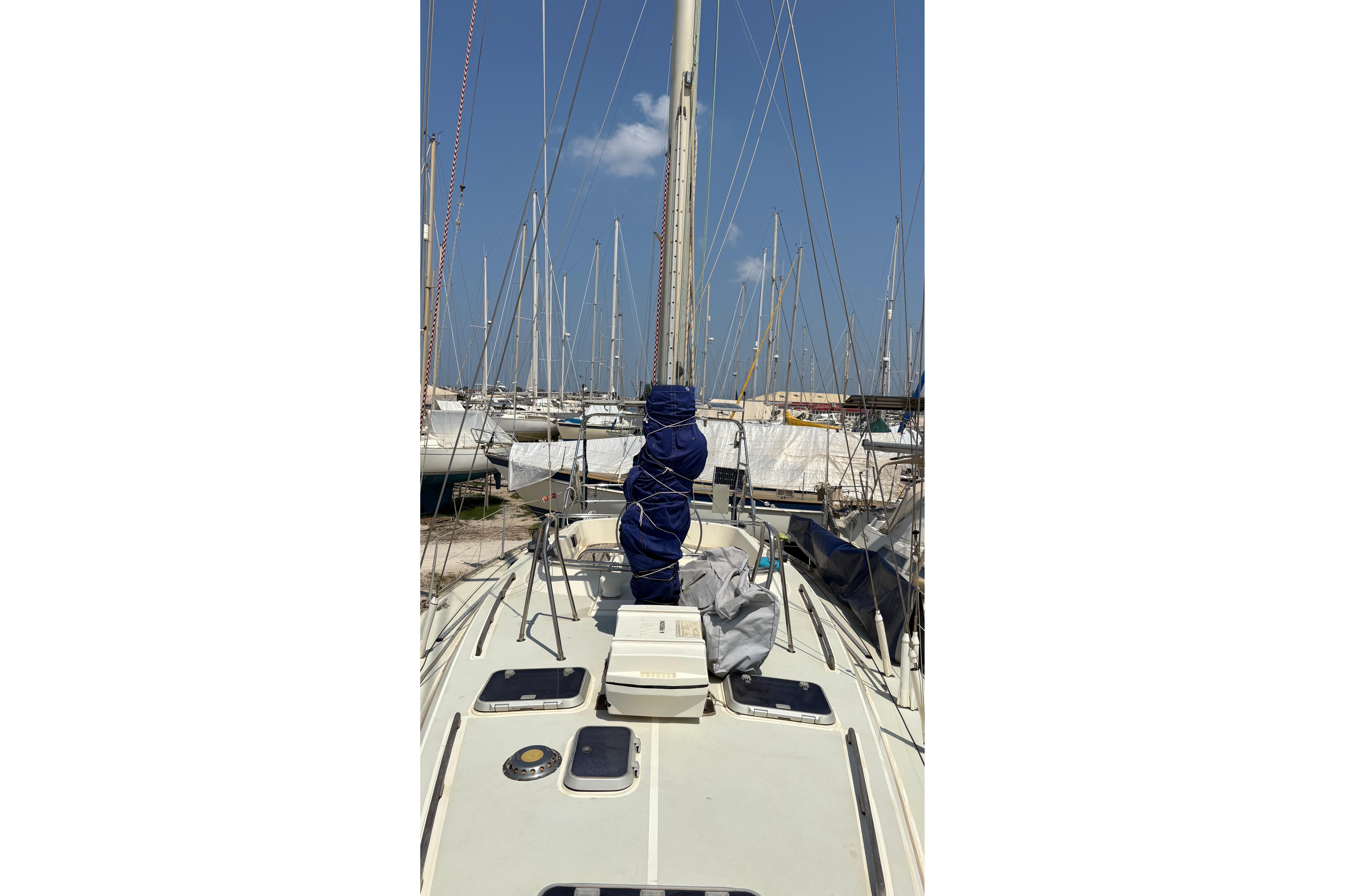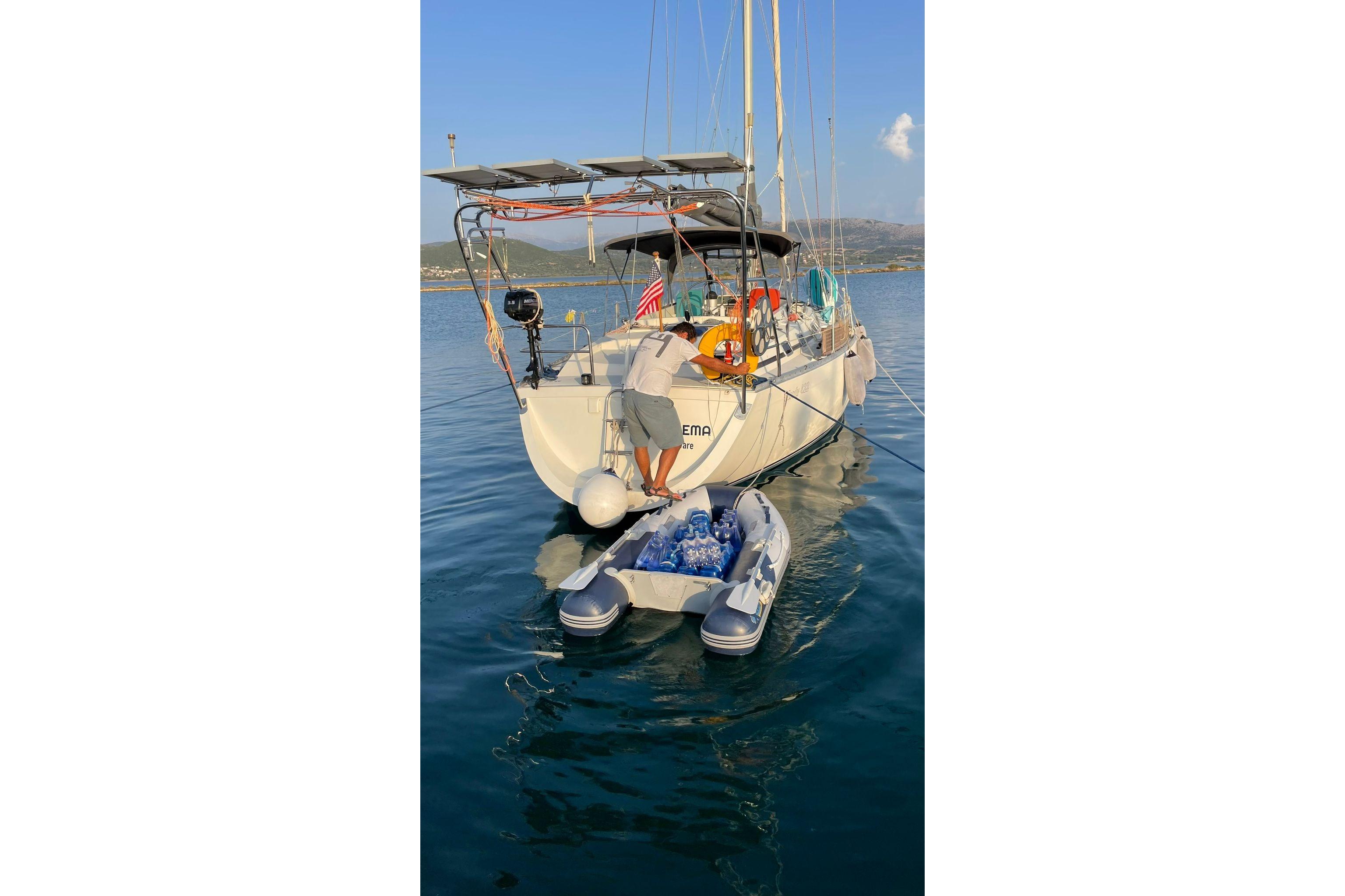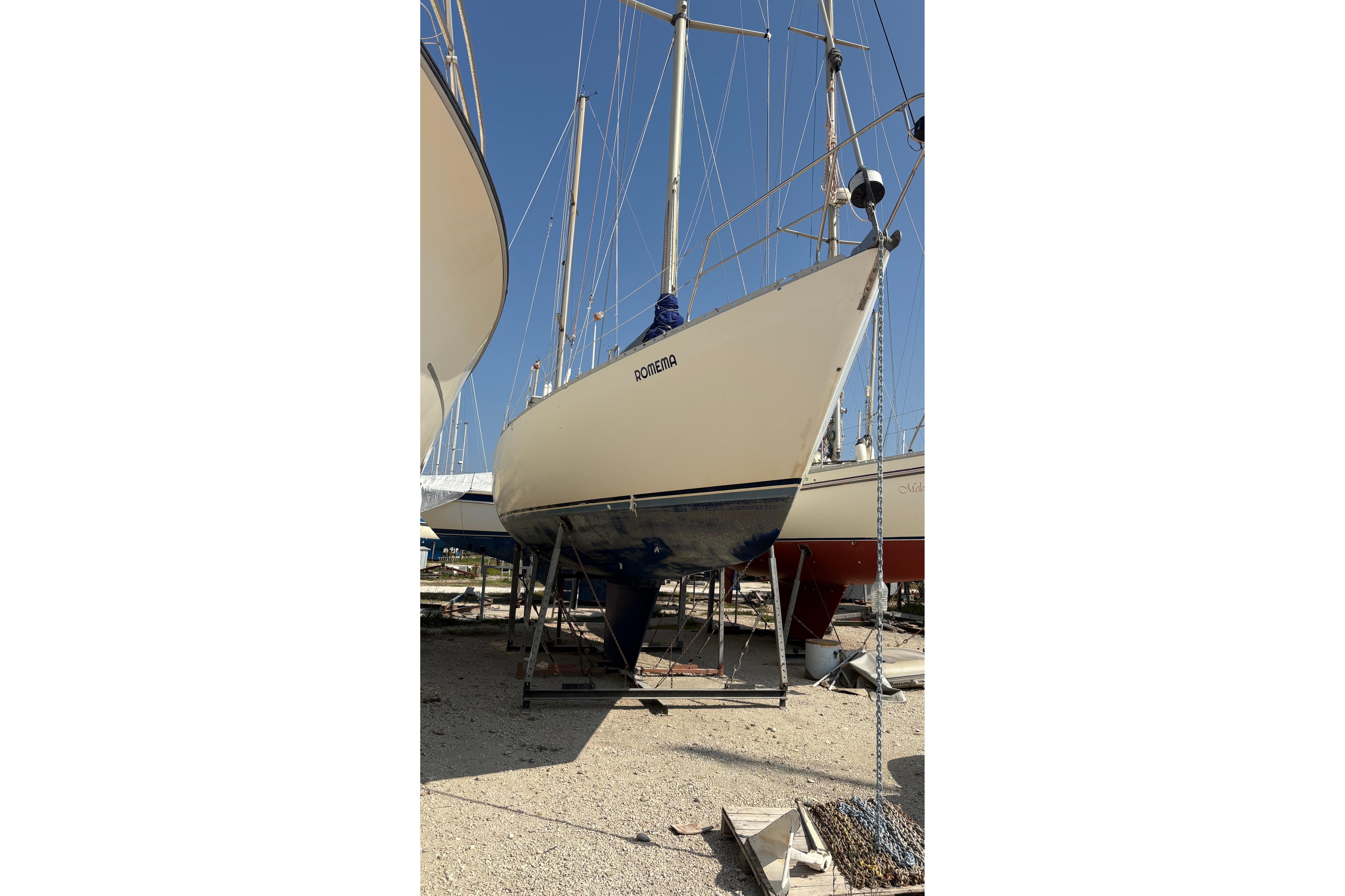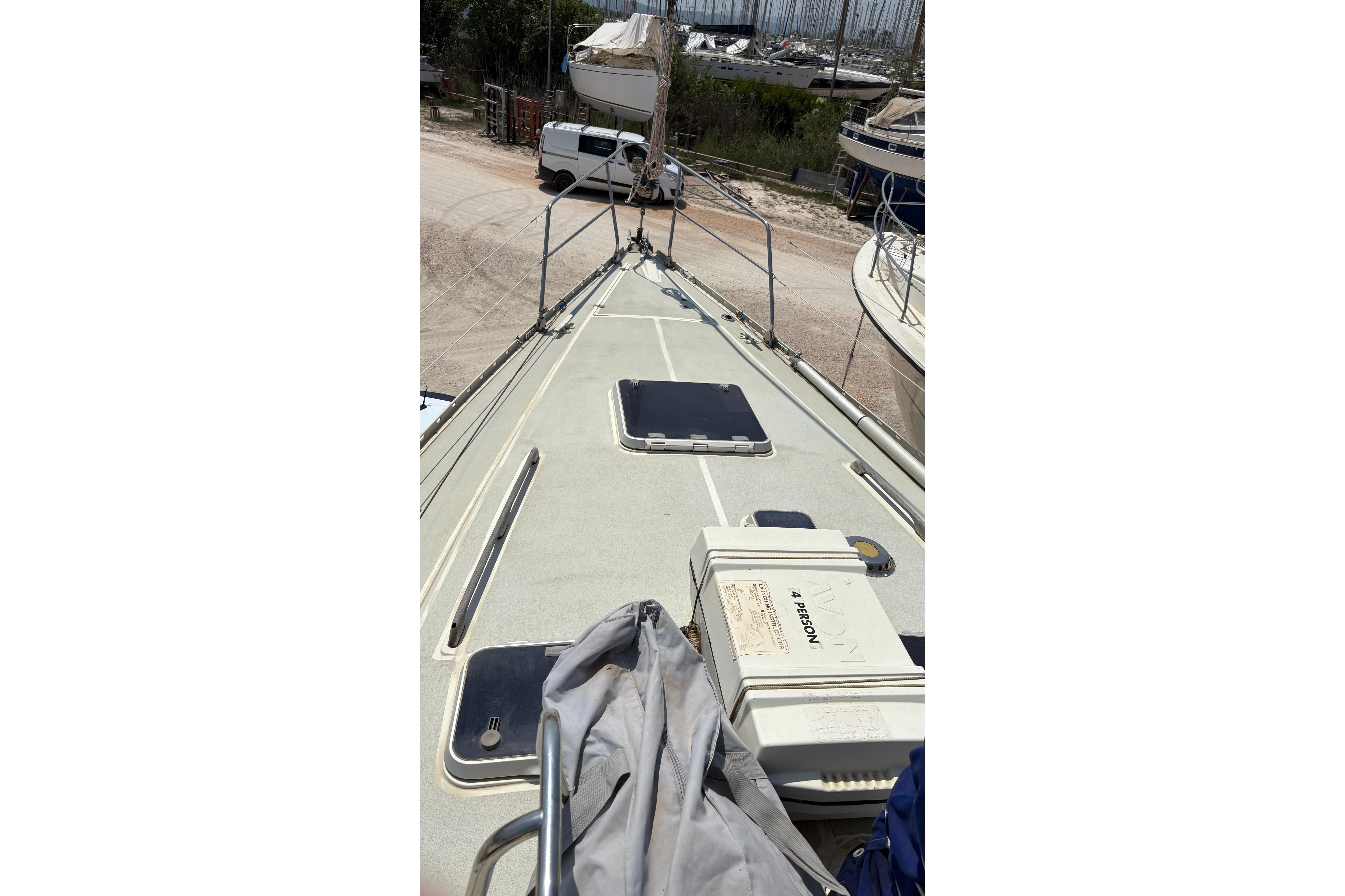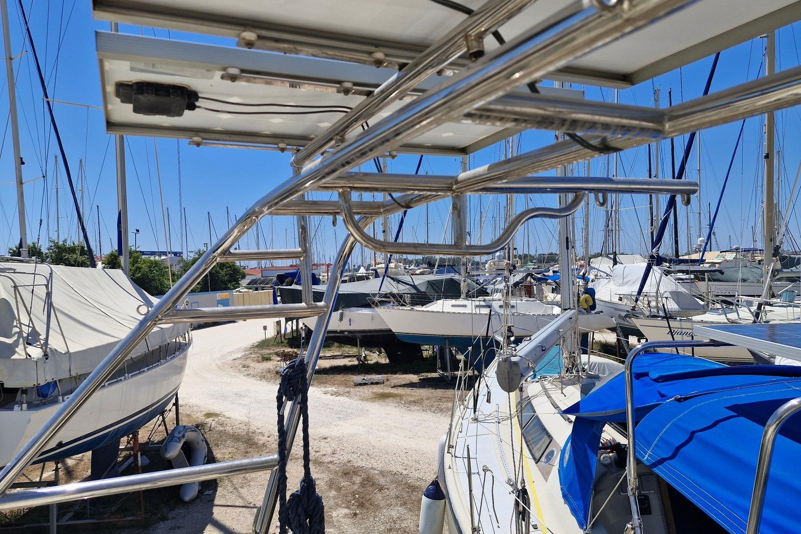 Currently ashore in Preveza, Greece and now registered under the Delaware (USA) flag, she offers comfortable accommodation for six in three cabins plus saloon, with two heads. Equipped with electric windlass, Raymarine navigation equipment and solar panels, she represents a capable and sensibly specified cruising yacht ideal for extended Mediterranean cruising.