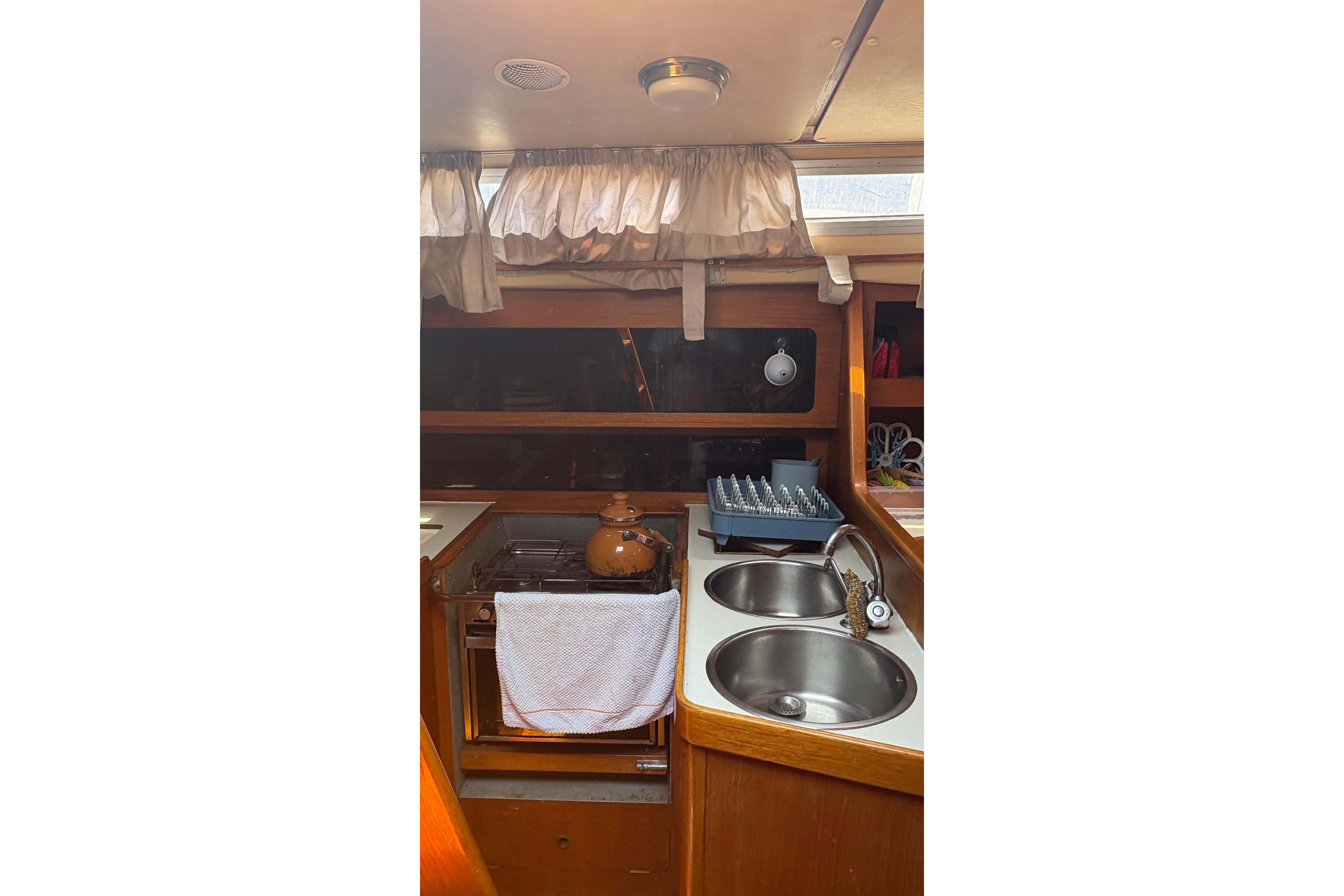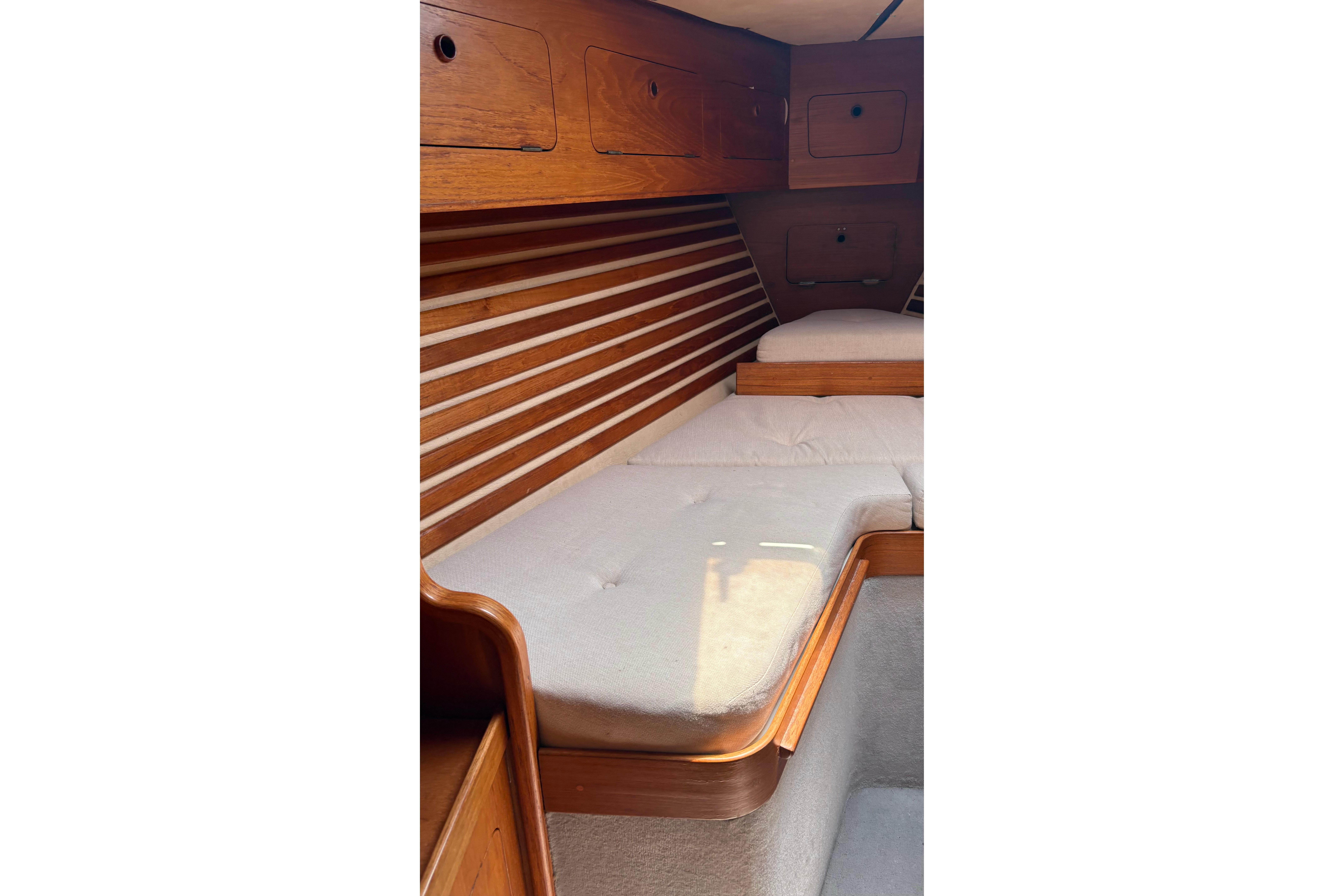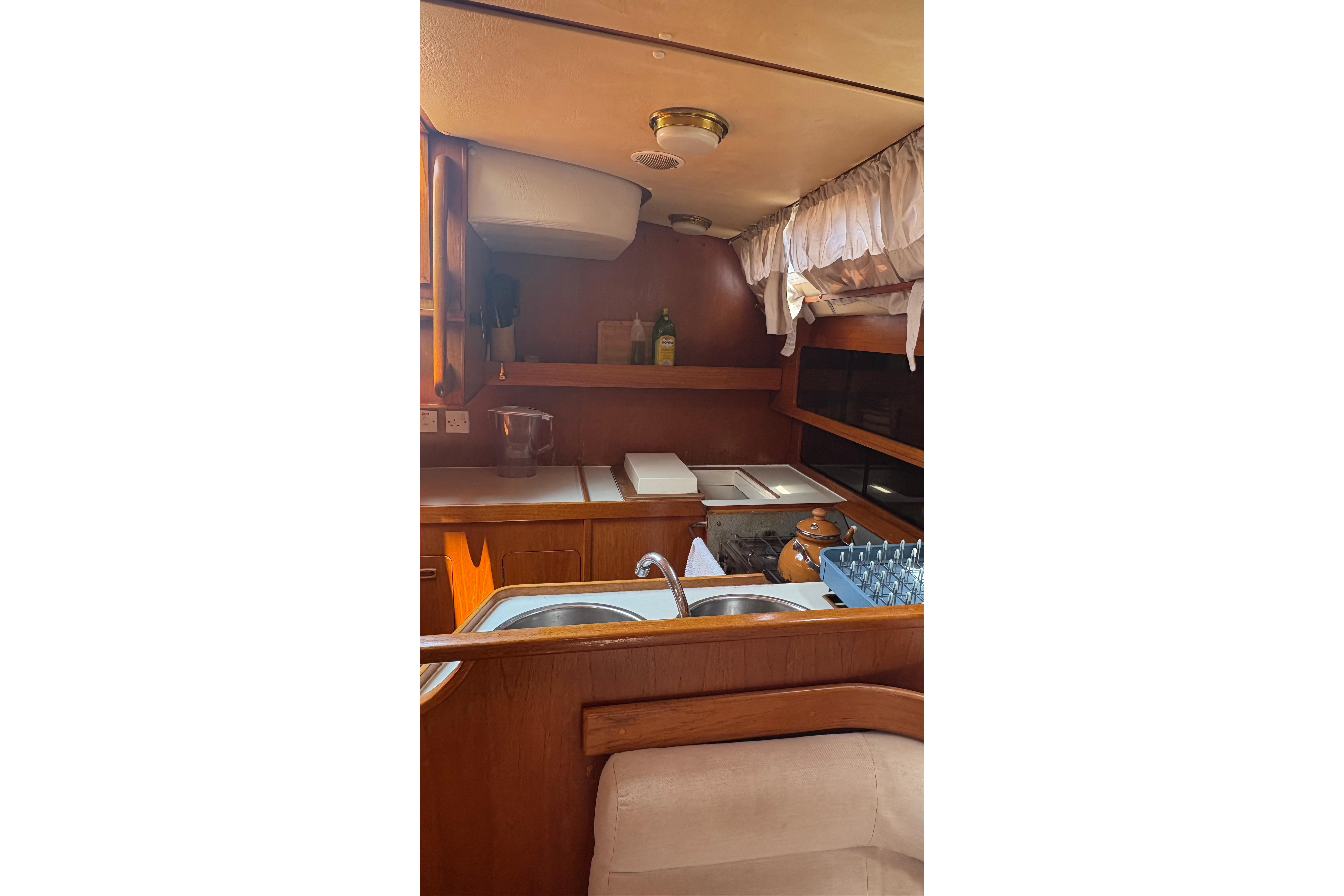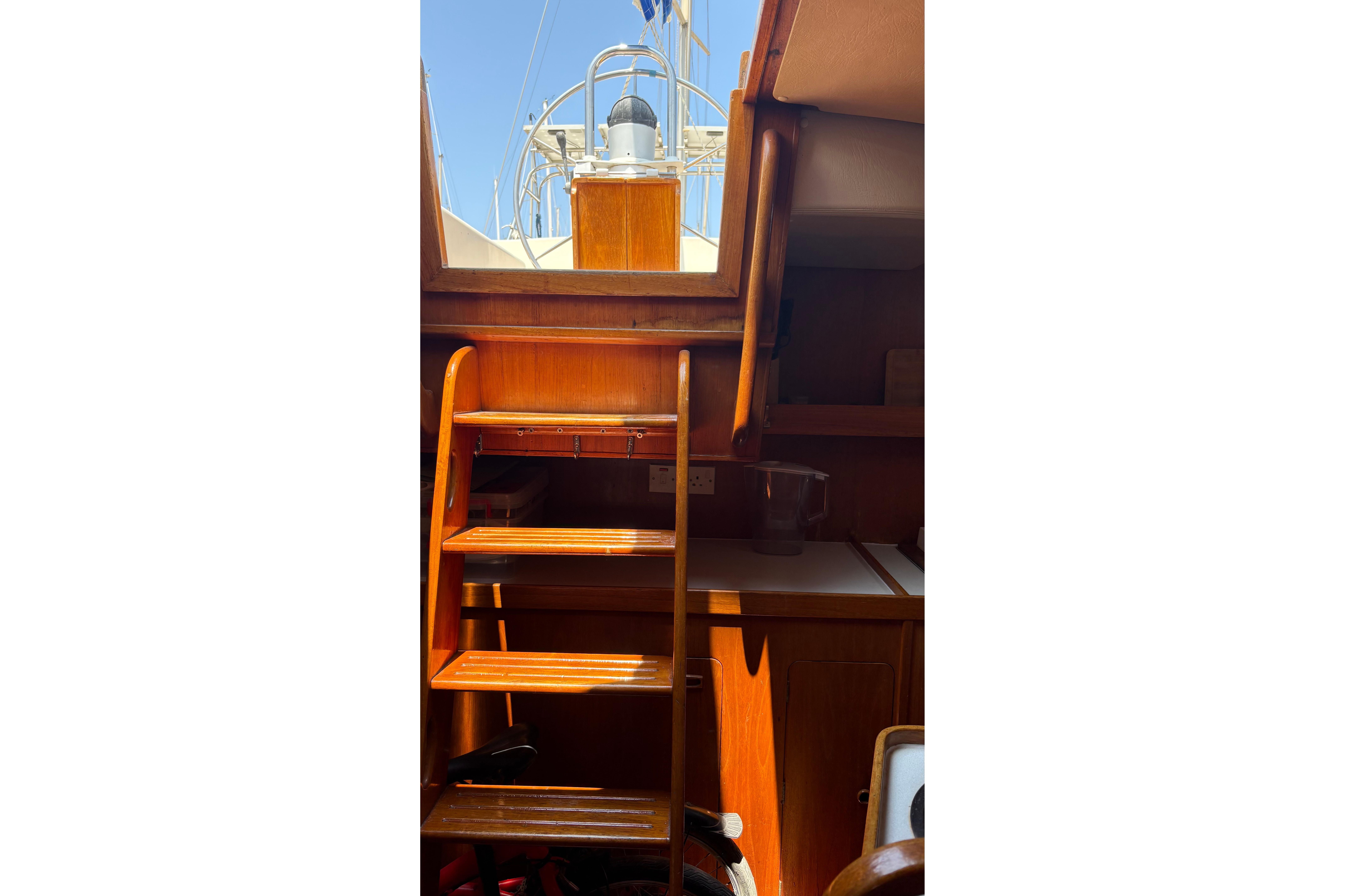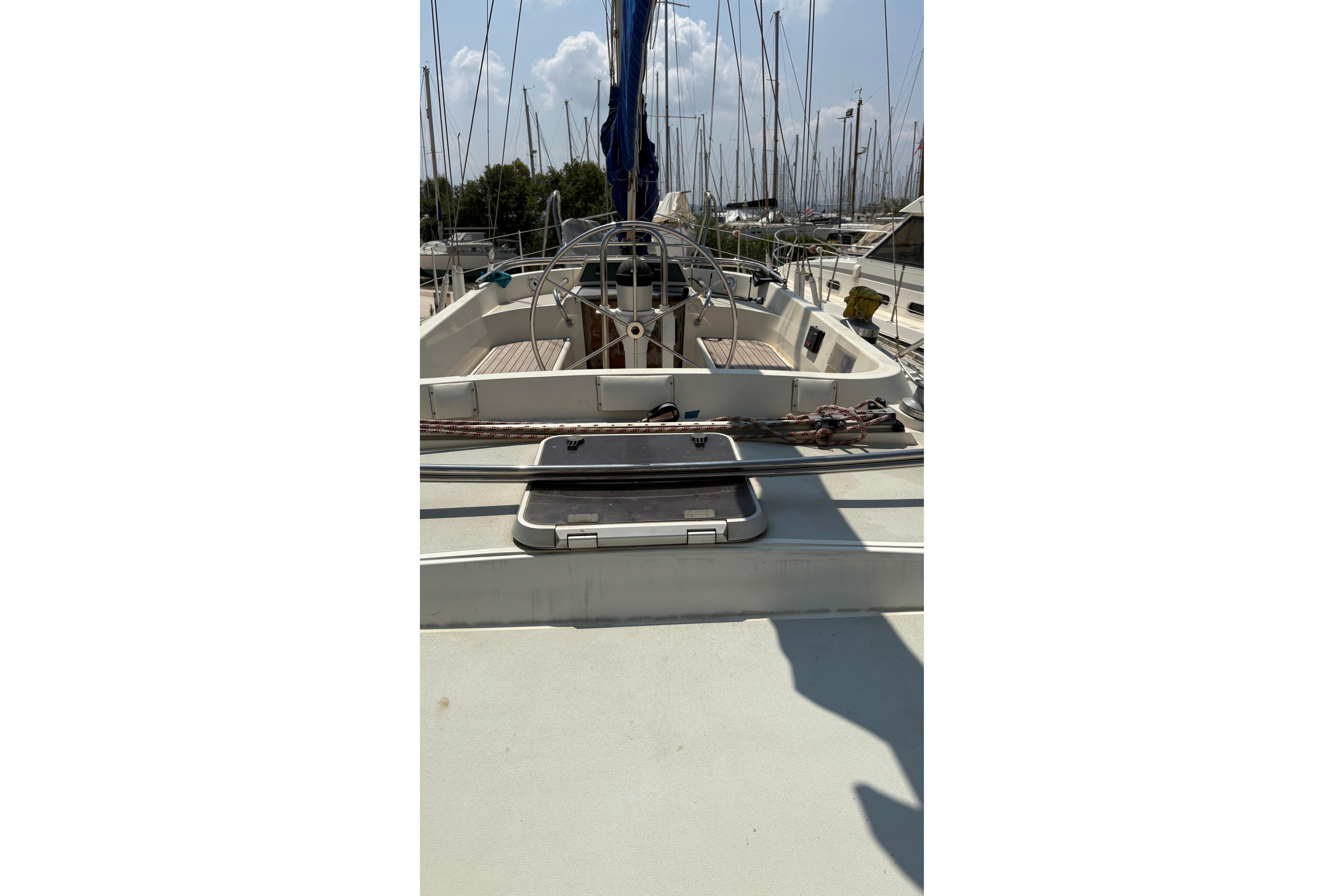 The Moody 422 is widely regarded as one of the most capable cruising yachts of her era. She is solid, steady and reassuring under way, with a stiff hull form and balanced helm that make longer passages comfortable and predictable. Her centre cockpit offers security at sea, while below decks she feels far larger than her 42 feet would suggest.