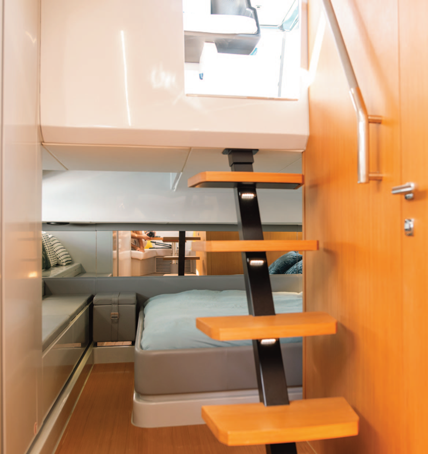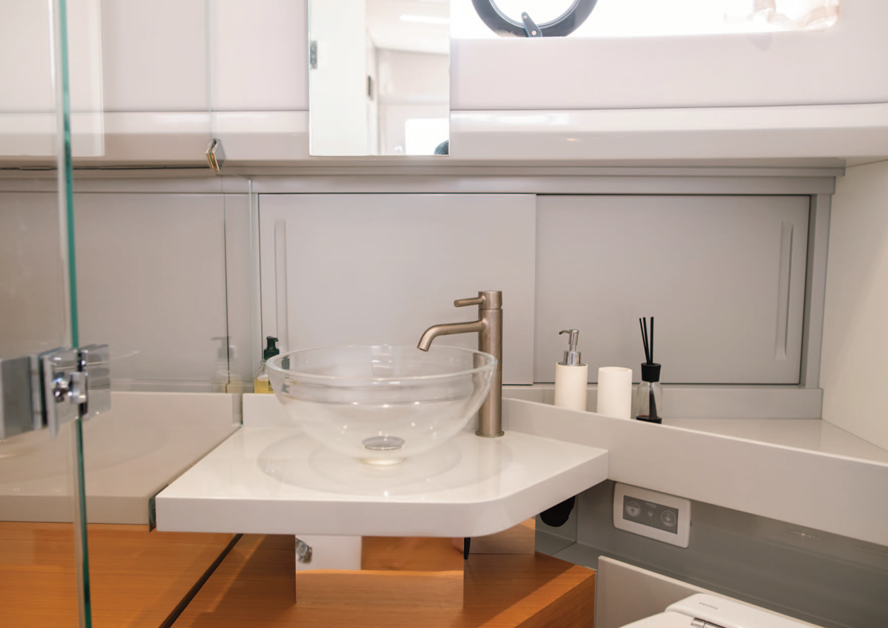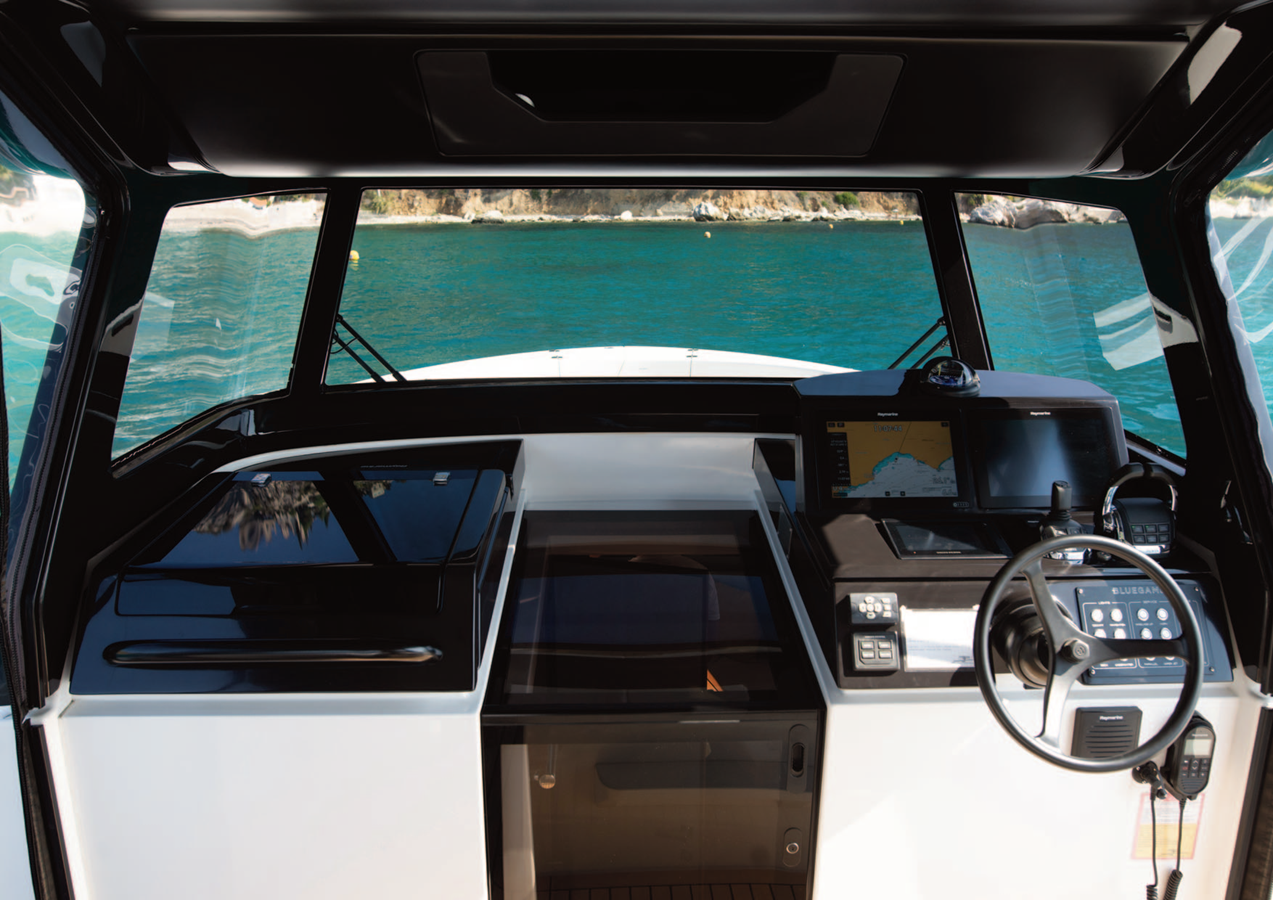 Below deck, despite being renowned for her exterior design, BG42 once again stands out. She comfortably accommodates up to four guests, featuring a full-beam owner’s cabin and a spacious U-shaped bow sofa in the salon/dining area that converts into an additional double bed.